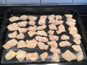 - Step 7 Then, let the dunking begin! dunk each piece of chicken into the flour, then egg, then breadcrumbs, then lay each piece onto the prepared baking tray… repeat until all chicken nuggets are on the tray ready for cooking.