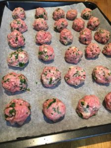 - Step 4 With your hands mix all the ingredients together. Once all mixed in, it’s time to roll all the meatballs out to whatever size you like, and place them onto the prepared baking tray leaving about a 2cm space between each meatball (We usually roll each meatball about the same size as bub’s fist) TIP: wetting your hands with water between each couple of meatballs makes it easier to roll out each meatballs preventing the mince from sticking onto your hands. Place tray into oven on 170 degrees celcius for about 10-15min.
