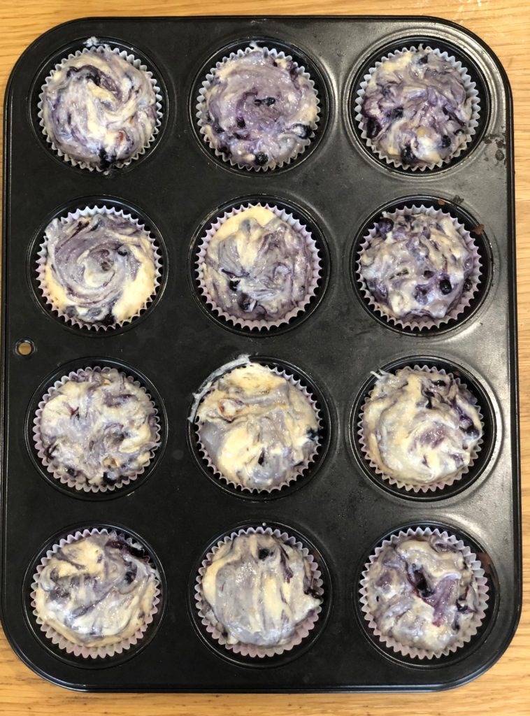- Step 6 Now add the dry ingredients to create your cake mixture. Gently fold through the blueberries into your mixture, then pour the mix into each muffin hole. Bake for 20-25 minutes until cooked. Then leave to cool completely.