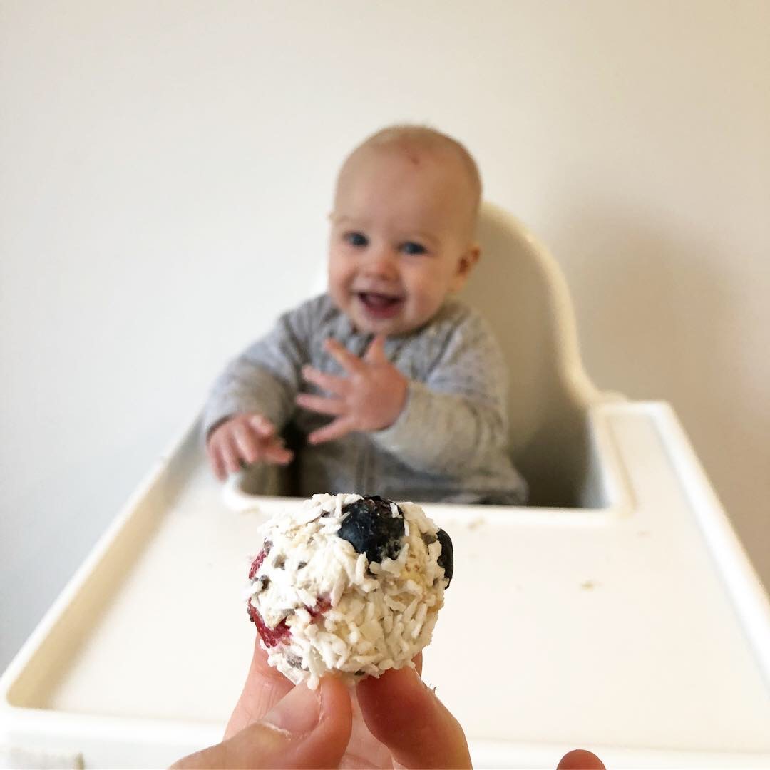 These SUPER easy Snow Balls are a staple in our family for #myblwer Ava. They are suitable for 6mo+ they are nice and soft to chew on and so easy to handle without the mess. We have been offering these to Ava since she was 6mo, I wanted a breakfast that I could offer Ava without the mess, easy to pick up and full of nutrition. They are so easy to make, I usually prepare them on Sunday evening and they will last a few days. I offer these to bub for breakfast or snacks when are busy (which is always hehe) and on the run. These balls include full fat greek yogurt which is a great source of calcium for growing babies! Ava does not drink cows milk, so this was a great way to get more calcium into Ava's diet.