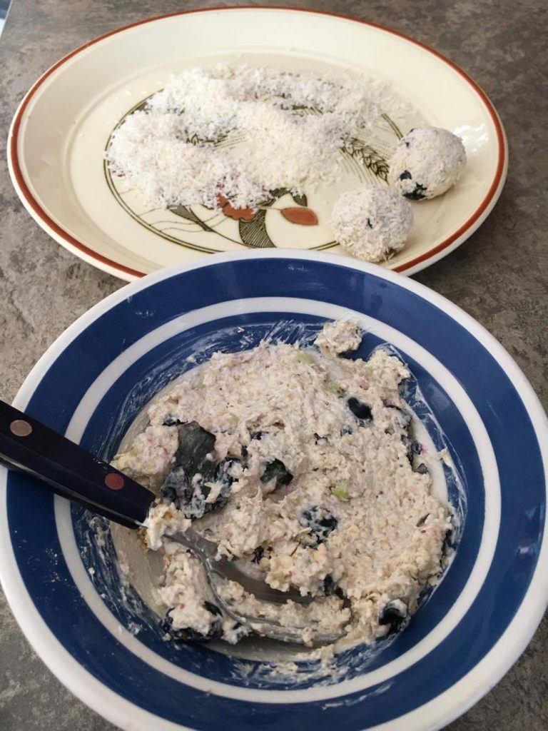 - Step 1 In a bowl combine raw oats, yogurt, *blueberries (*or your choice of fruit), feel free to squish/break in half the blueberries into the mixture so the flavour is throughout the snow balls. Also add 1/4 cup of coconut until the mixture becomes a sticky, wet consistency. (see photos below)