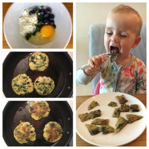 Spinach & blueberry pancakes, best of both worlds... savoury and subtly sweet, full of goodness. For 6mo+ bubs. Pancakes are a great way to introduce egg into bubs diet, plus you can pack them with full of goodness for bub to pick up, hold and nibble/eat....either with their fist (young starter babyledweaners 6-8mo), use their pincer grip (usually developed around 8mo+) and older bubs that are using/practicing with cutlery like Ava (around 12mo+)... Blueberries are high in antioxidants and they also contain fiber, Vitamin A and Vitamin C. Organic spinach is a great source of iron, protein, fiber, vitamin A & E! Give em a go...