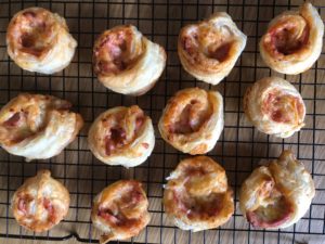 - Step 2 Roll up the pastry with toppings (long ways – from the long side up).Then cut into 1 inch pin wheels, then lay them all out facing up on a non stick pan.