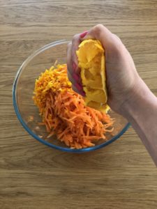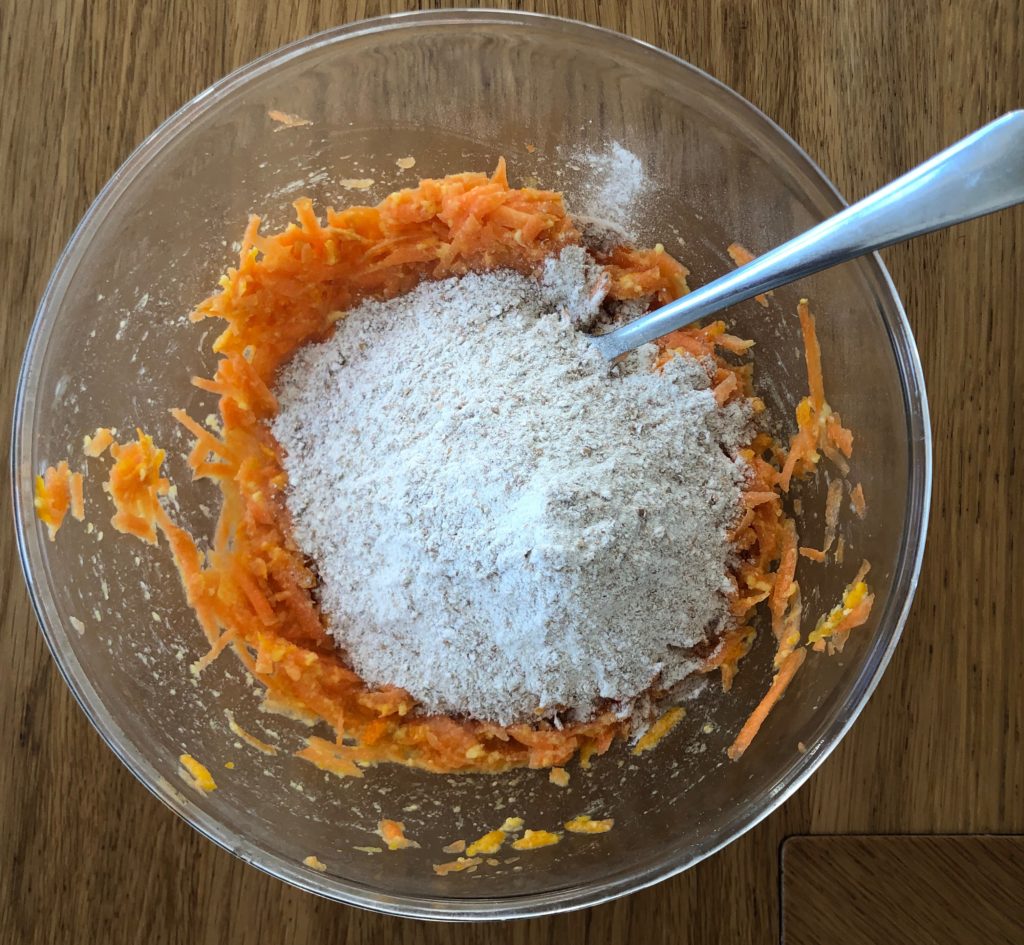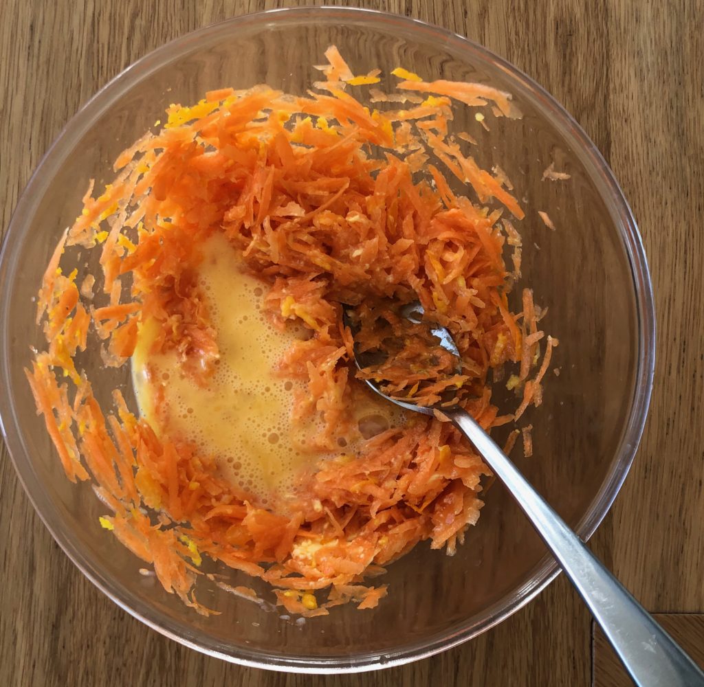 - Step 1 Pre-heat oven 190 degrees celcius, then line muffin tin with paper cases or grease a silicone muffin tray. Grate carrots and place in a bowl. Then squeeze out the orange juice from the oranges into the same bowl and grate the zest from 1 of the oranges.